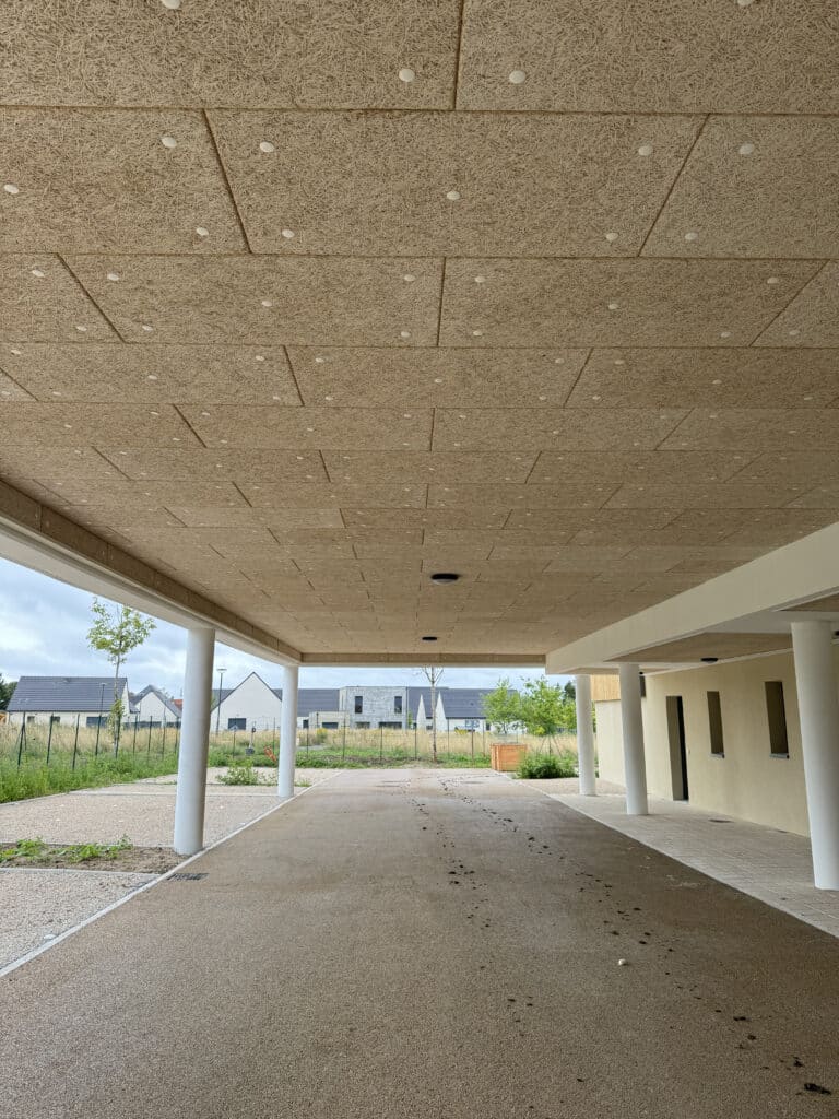 Entrée couverte moderne avec plafond acoustique en laine de bois. Allée en gravier résiné. Colonnes et façade jaune pâle. Lotissement neuf.